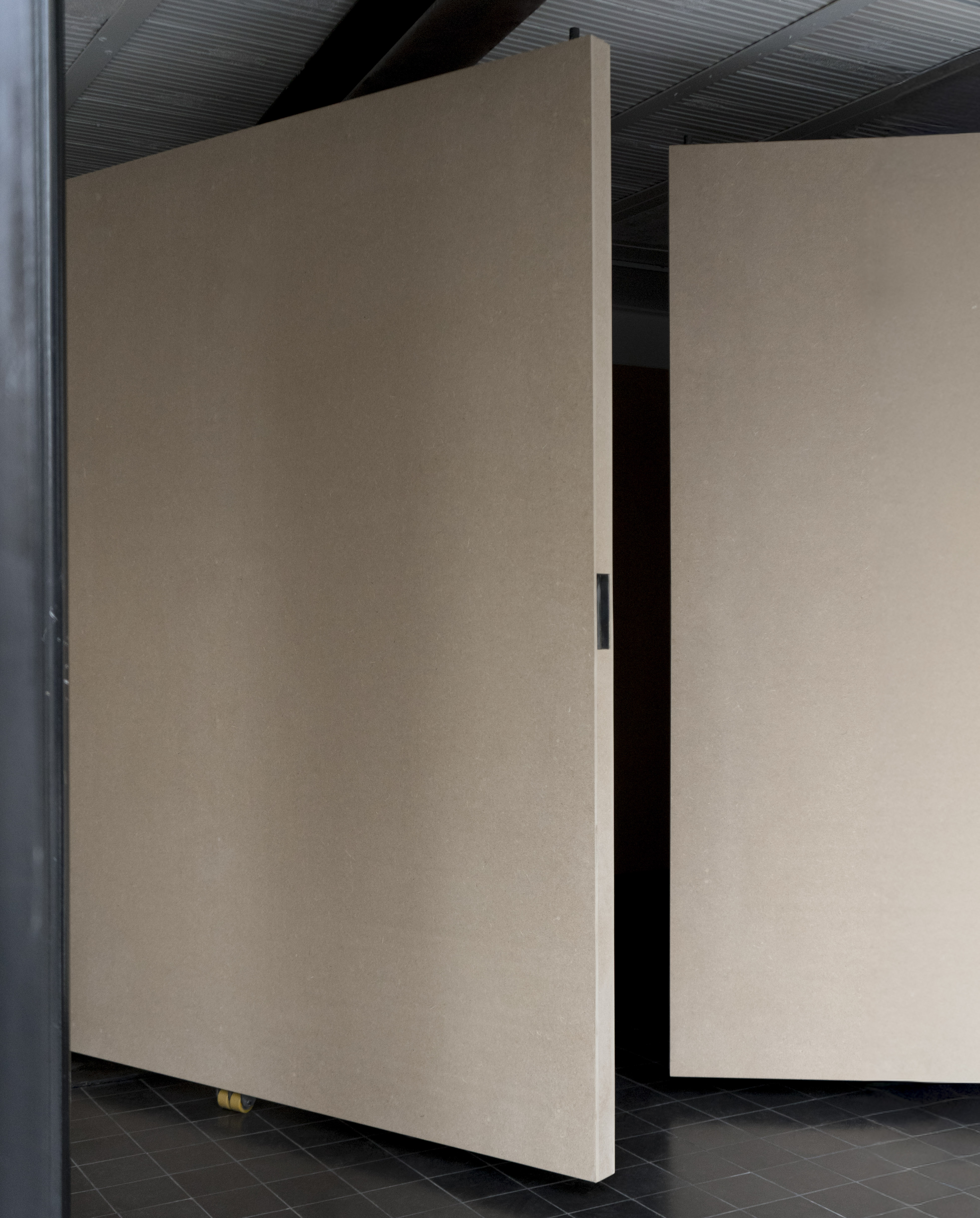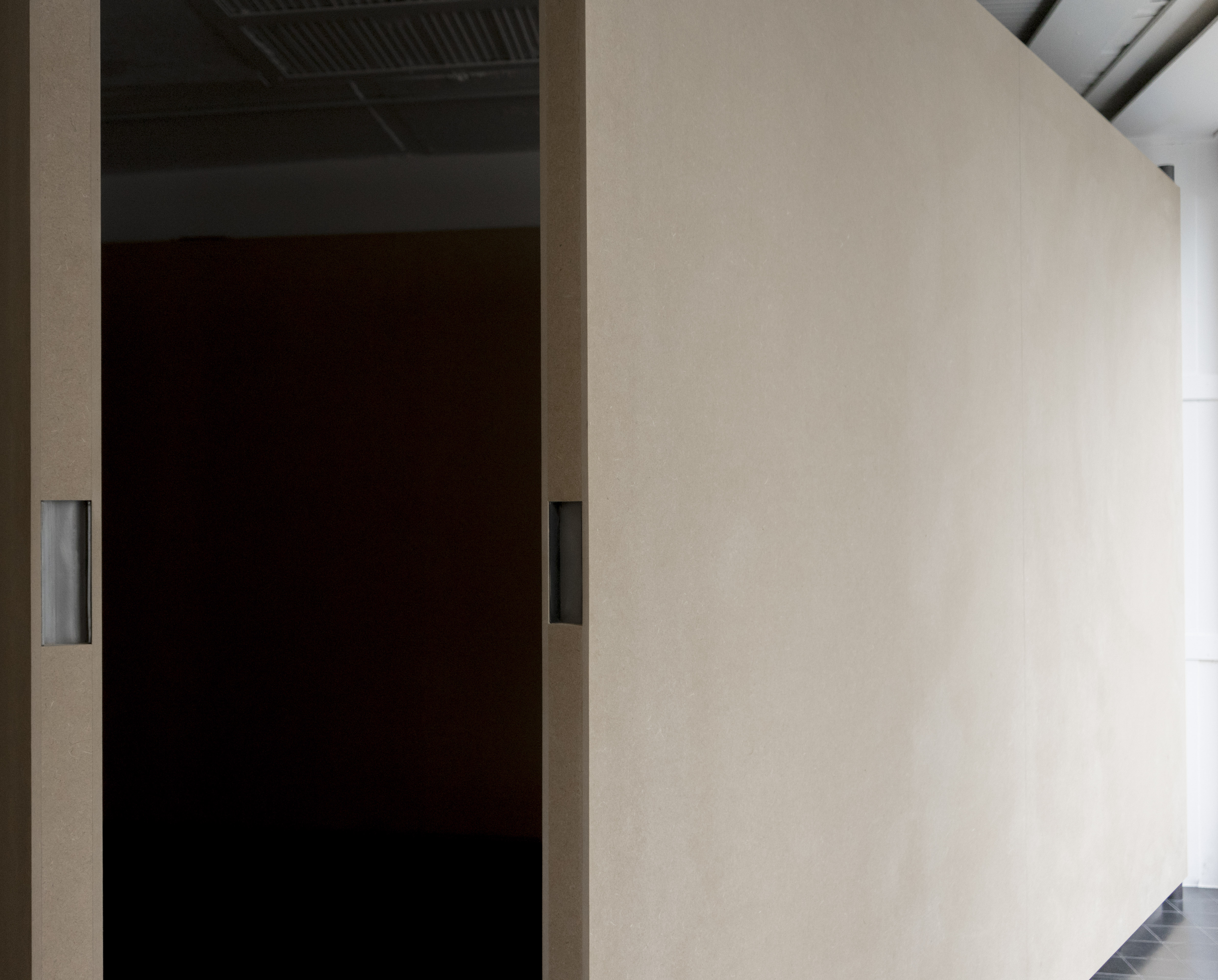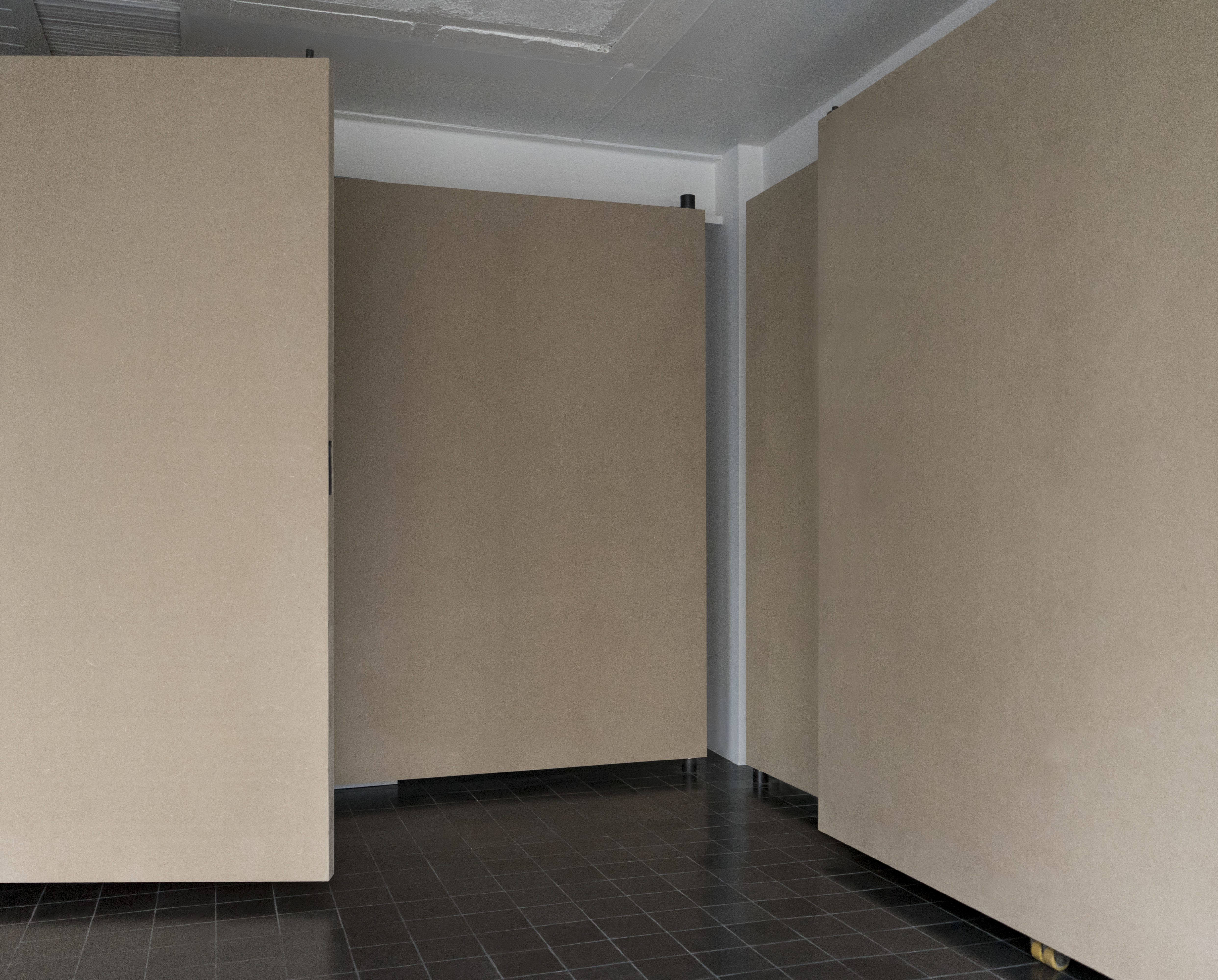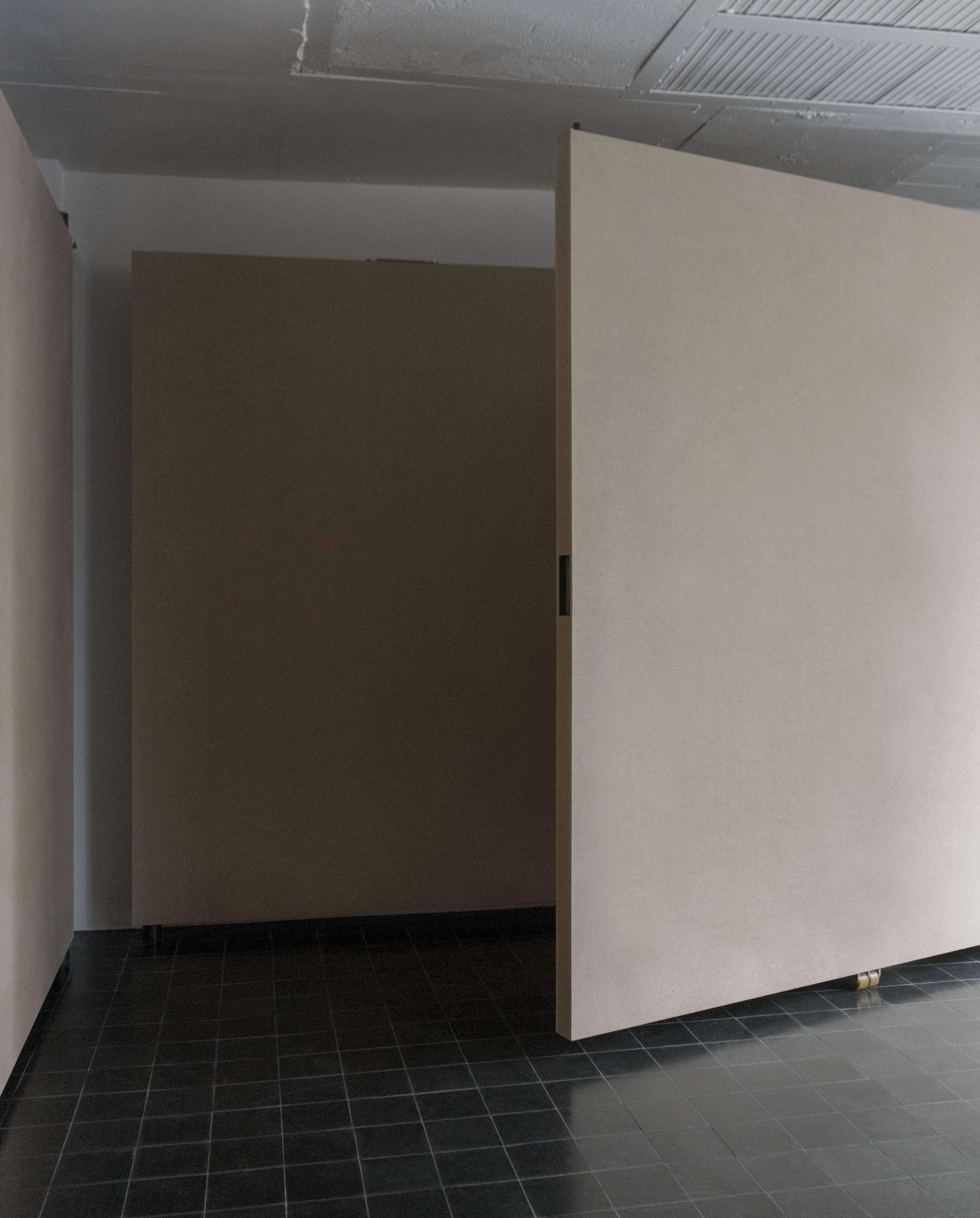 4 cloisons se détachent des murs de la galerie créant une zone intime d’exposition. Les parois pivotantes permettent des circulations et configurations multiples.