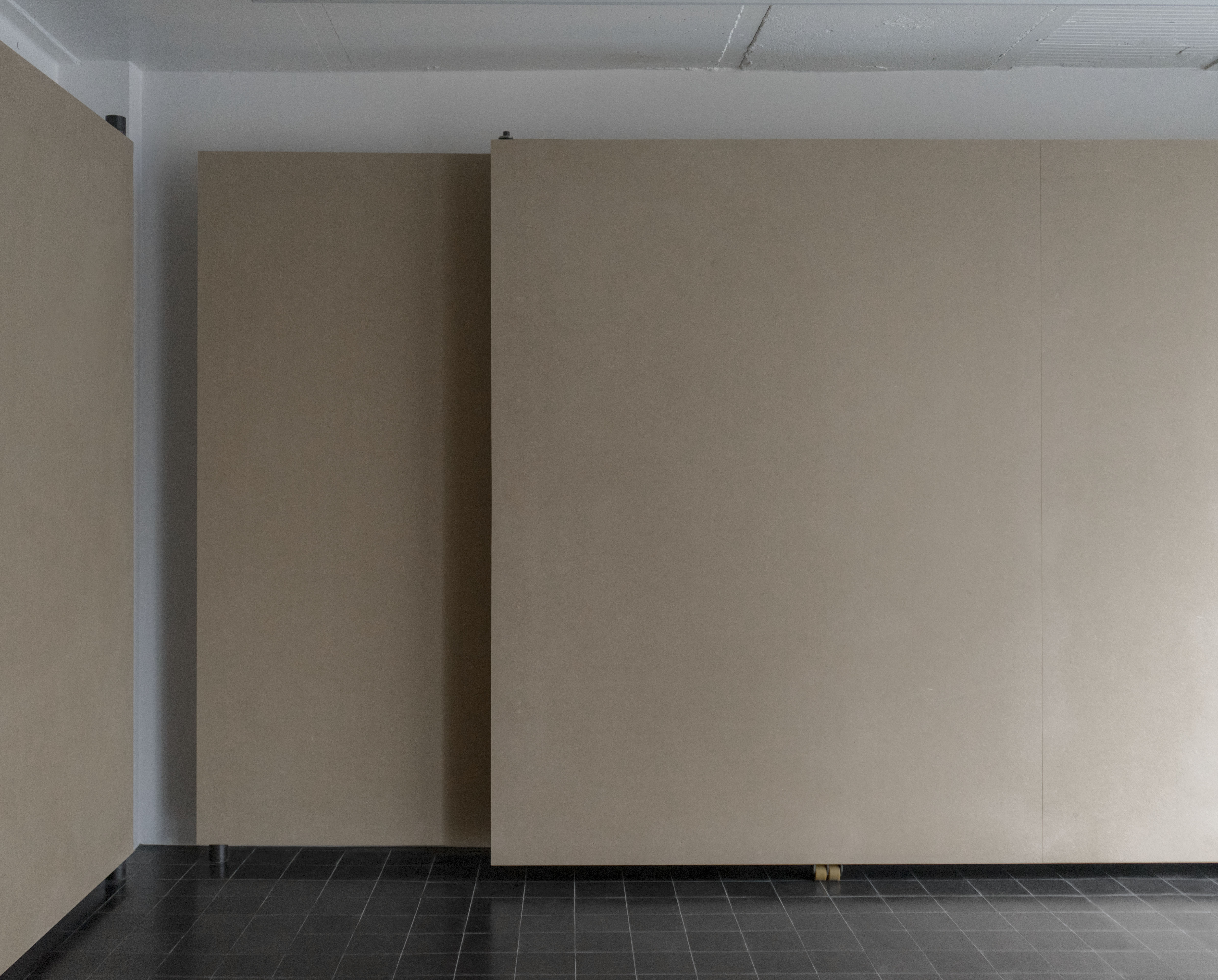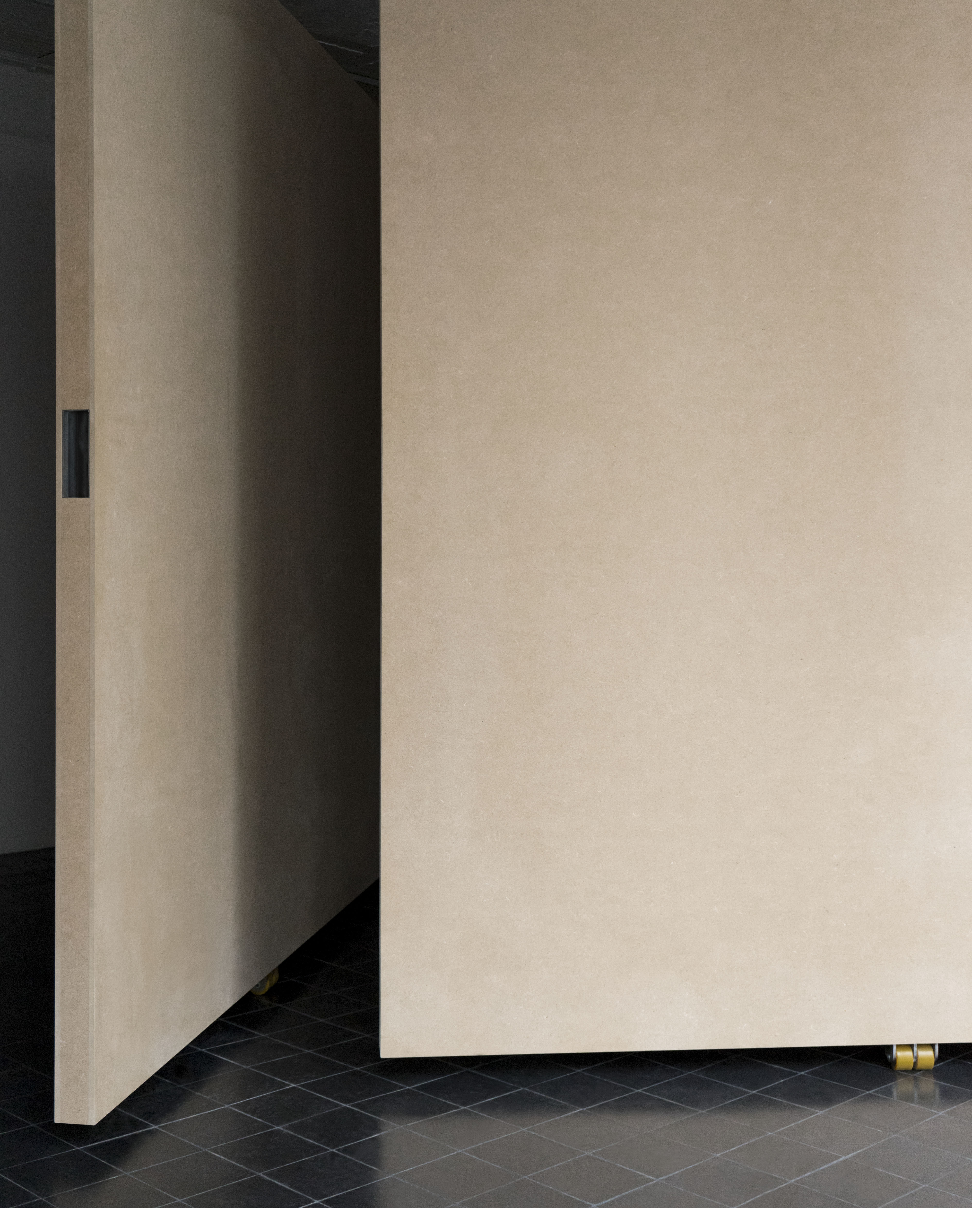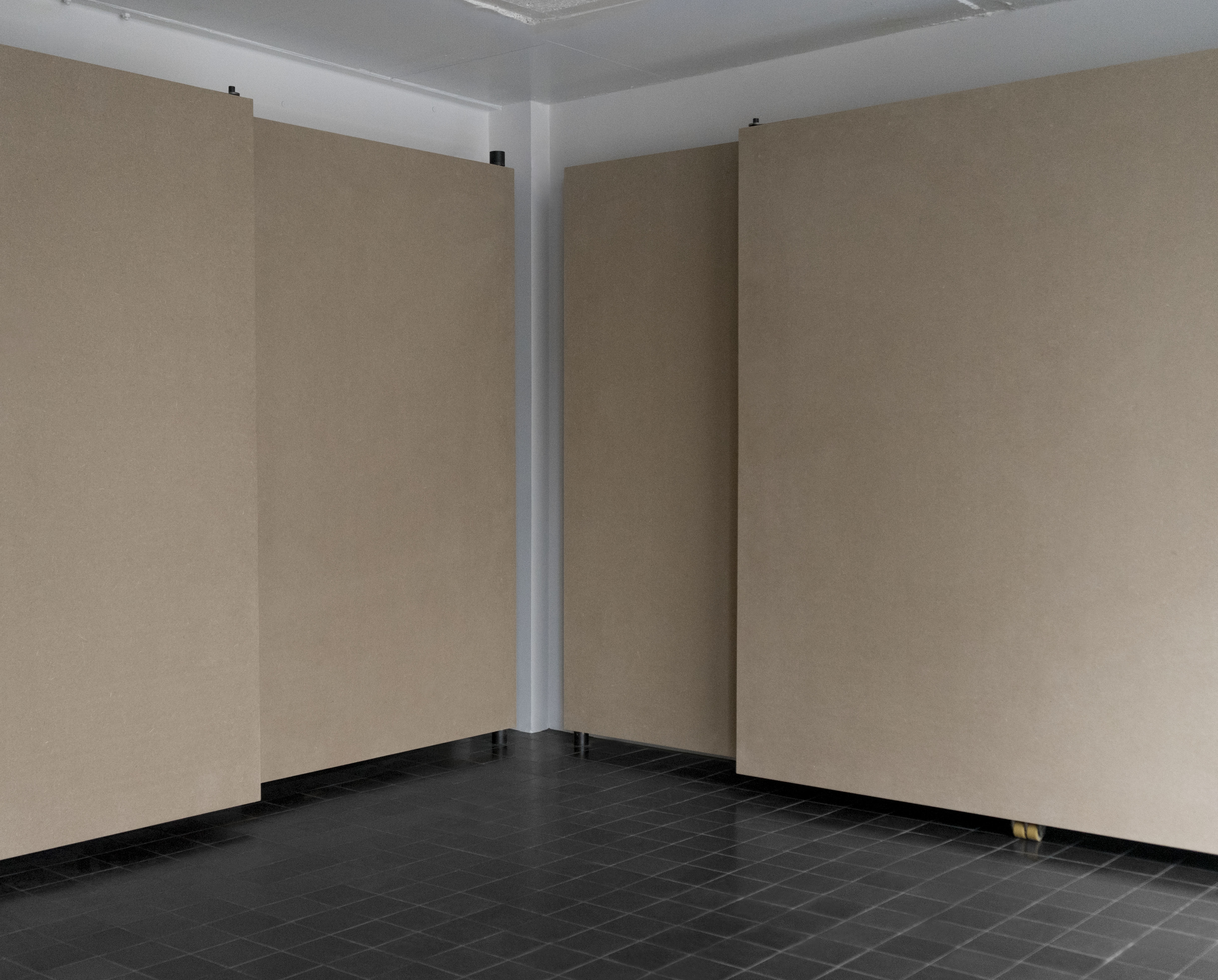 4 cloisons se détachent des murs de la galerie créant une zone intime d’exposition. Les parois pivotantes permettent des circulations et configurations multiples.