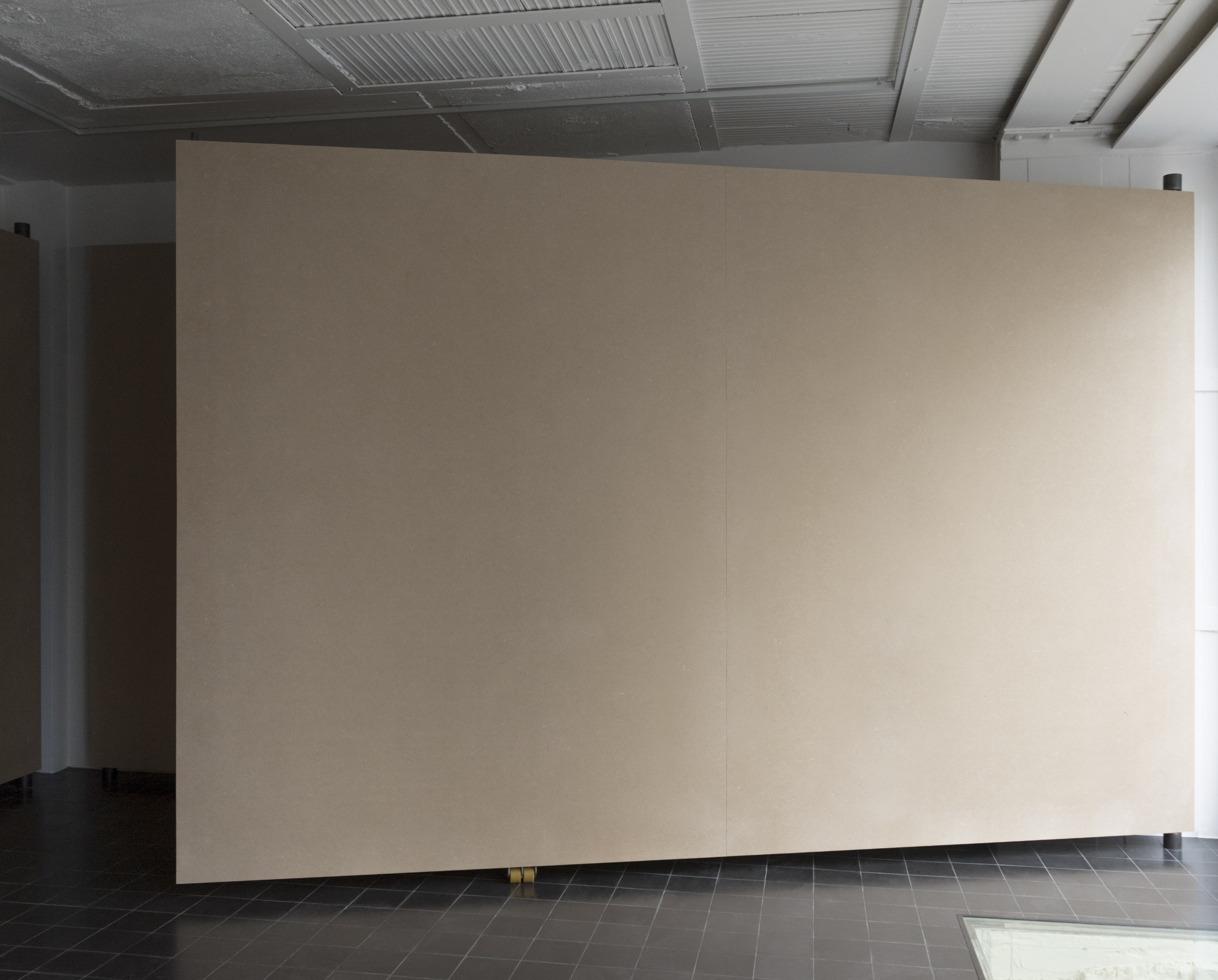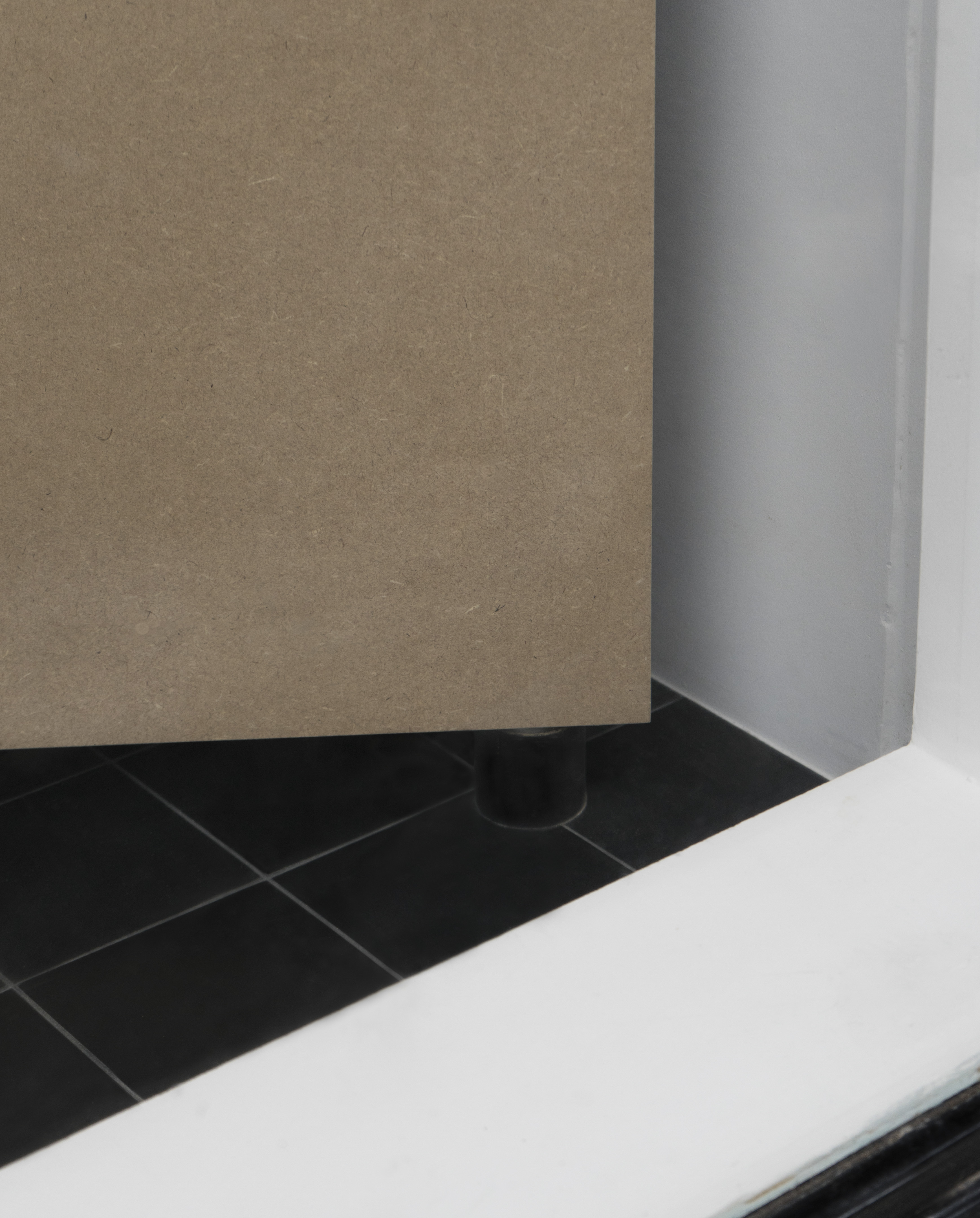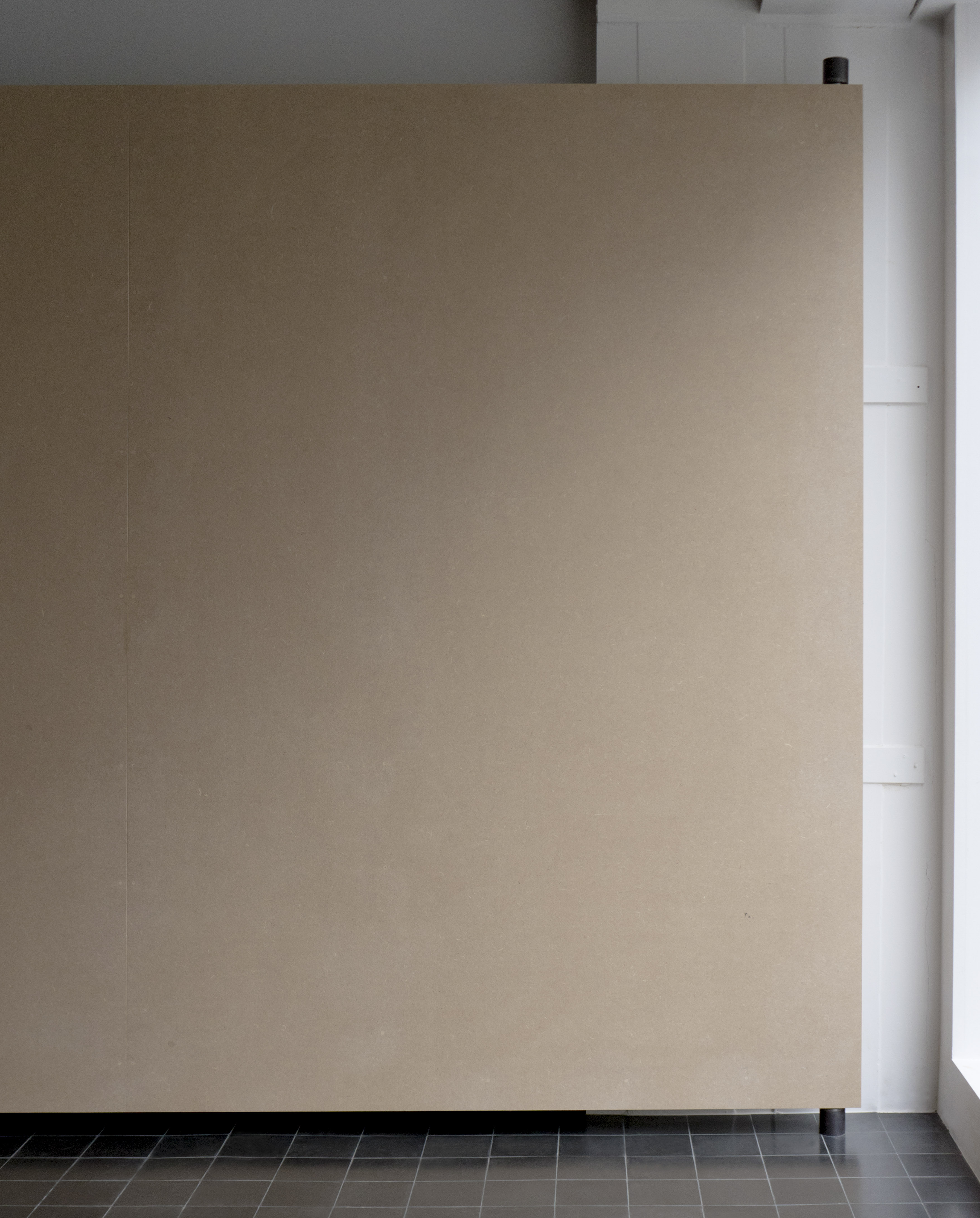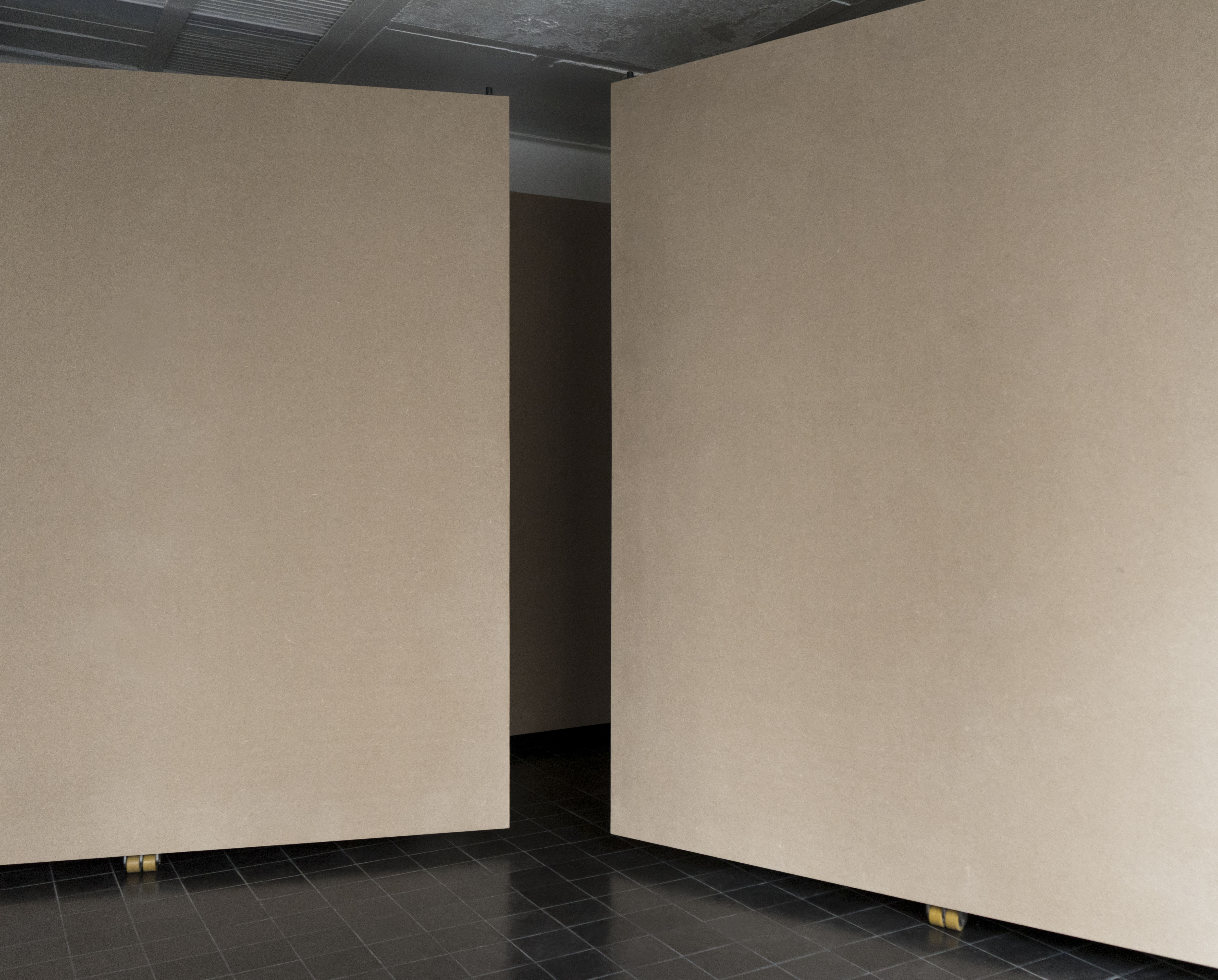 4 cloisons se détachent des murs de la galerie créant une zone intime d’exposition. Les parois pivotantes permettent des circulations et configurations multiples.