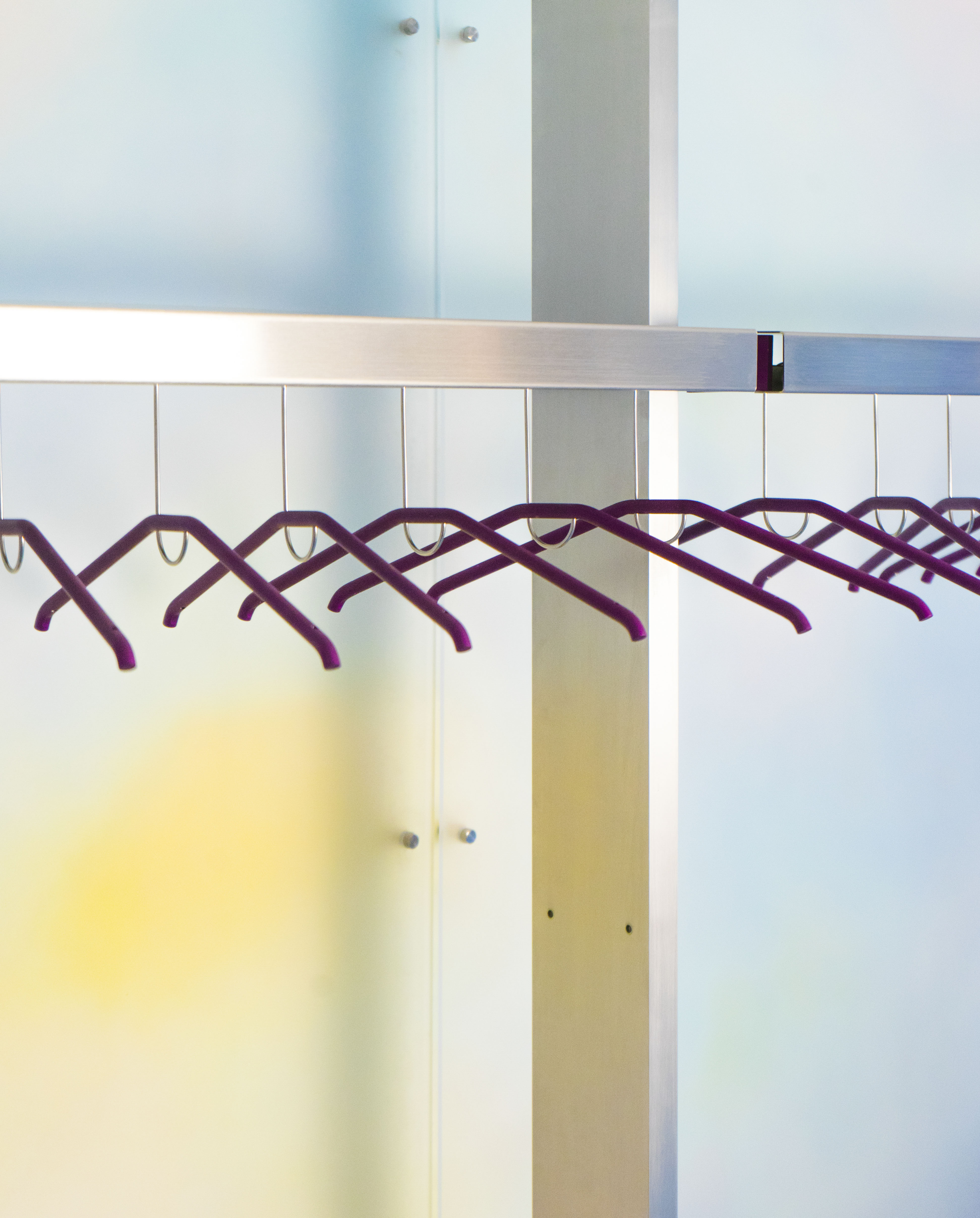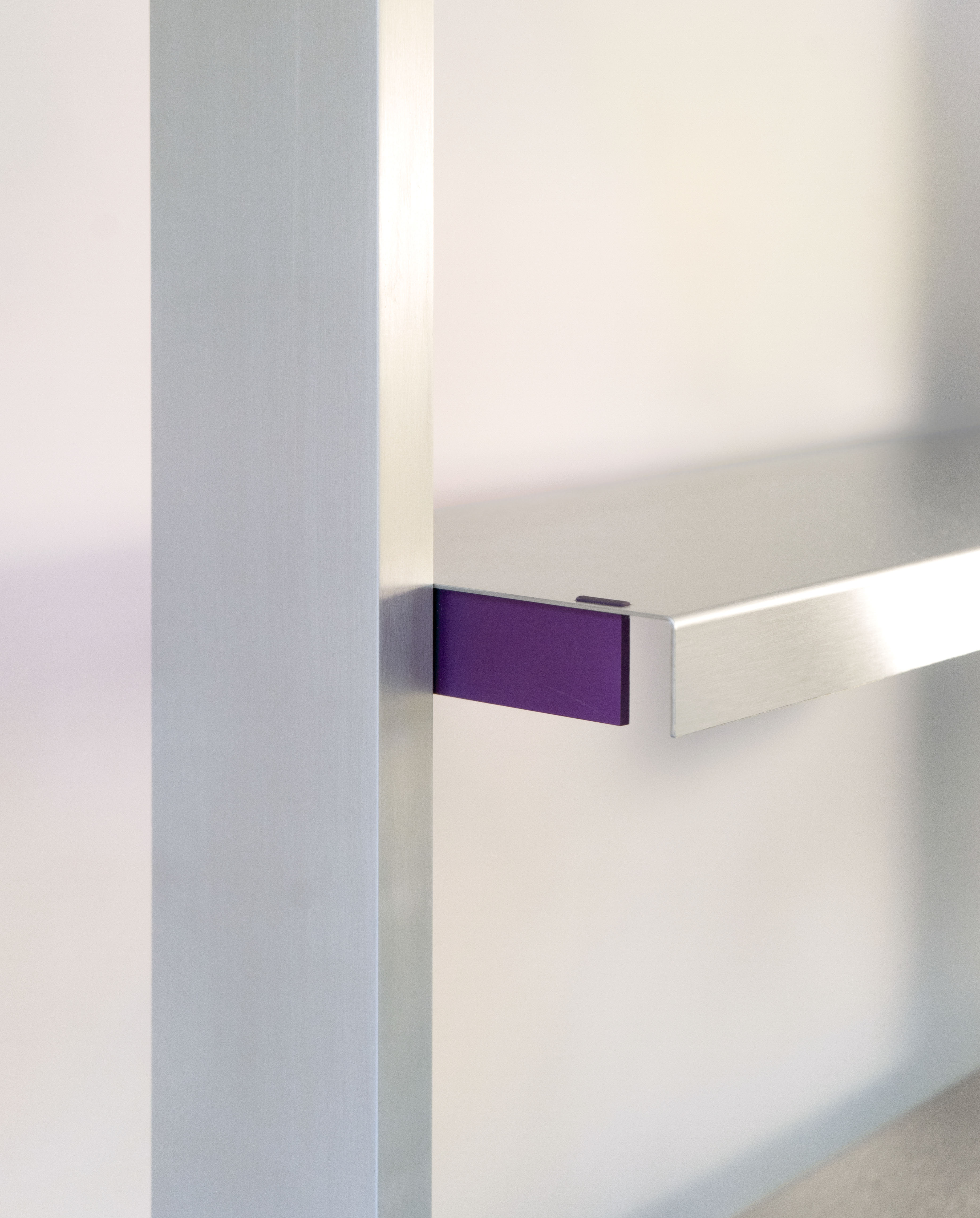Etagères suspendues sur une grille interchangeable. Le système de construction est rendu lisible par la mise en évidence des pièces de connection colorées.