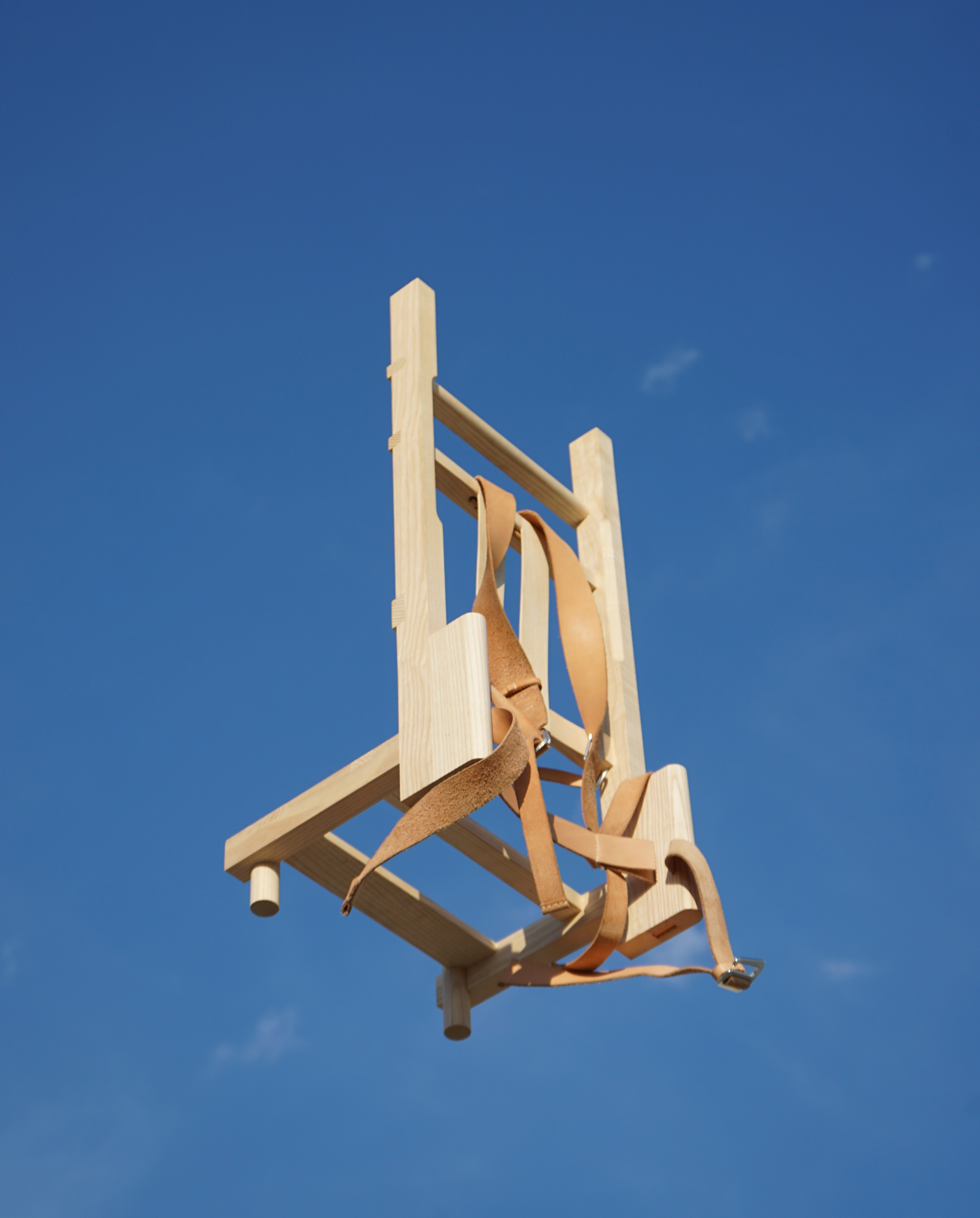 frêne verni, frêne teinté noir, cuir, sangle polyester